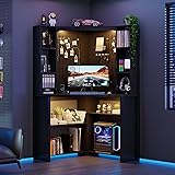 Lvifur Corner Computer Desk with LED Lights, L Shaped Study Desk with Hutch & Shelves, Triangle Home Office Desk with Charging Station for Work & Study, File Cabinet Bookshelf for Small Space (Black)