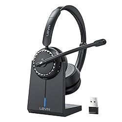 AI Noise Cancellation and Instant Mute:Enter a world of unparalleled clarity with LEVN wireless headset - it can eliminates 99.9% of background noise, ensuring your voice sounds clear and bright on every call. Whether you're in a bustling coffee shop or at a busy call center, callers can talk to you as seamlessly as if you were face-to-face, making it the choice for remote workers. With the added call privacy of the mute button, allowing you to easily manage calls, protect privacy. Multifunction Charging Base:The charging base for this wireless headset with mic for work offers versatile charging options and includes storage for a USB dongle. It features 4 USB ports, providing flexibility for fast and efficient data transfer. Additionally, it supports connecting various peripheral devices such as mobile hard drives and USB flash drives. This functionality helps you manage multiple tasks, enhances work efficiency, and keeps your workspace organized. Bluetooth V5.2 & 2.4G USB Dongle:The bluetooth headset can let you experience the freedom and flexibility,offering two connection options: Bluetooth V5.2 and a 2.4G USB adapter. Say goodbye to tangled wires and workspace clutter. The USB dongle ensures a secure, stable connection with low latency and an impressive 49ft/15m wireless range. Stay connected and productive even when you step away from your desk, without any signal loss concerns. Ultra-Long Standby:This wireless headset with mic boasts a high-capacity battery, offering an incredible 65 hours of continuous playback on a single charge. Perfect for important meetings while working from home, it ensures you can maintain a professional demeanor effortlessly. Enjoy uninterrupted audio experiences with its long-lasting battery, free from the frustration of low-battery alerts. Immersive HD Stereo Sound and Comfortable to Wear:This bluetooth headset with microphone is meticulously designed with ear cups that envelop your ears, offering calls, music, and video experiences with stunning clarity. The lightweight and ergonomic design includes an adjustable headband and a 270-degree rotatable microphone, ensuring a perfect fit on either side. Ultra-soft ear pads provide unparalleled comfort, making them perfect for long wear.
