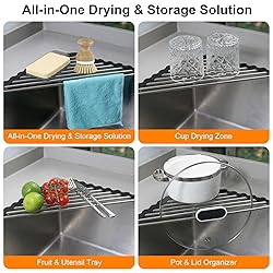 Premium Practical Grill Basket: Our grilling basket is made of food-grade stainless steel that resists rust, stands up to high heat, and will not corrode easily while staying firm in shape. Perfect for handling a wide variety of BBQ ingredients like sausage, shrimp, pork, and vegetables, these grill tools for outdoor grill are the perfect companion for any event, whether it's parties with friends, family barbecues, or romantic getaways. The handle of the fish grill basket is made from wood that User-Friendly Design: Our innovative grill mesh features a detachable handle, perfectly adaptable to your cooking style. Use the grill basket for outdoor grill in handheld mode for precise control over ingredients, suited for use with compact camping grills. Alternatively, place the vegetable grill basket directly on the cooking grate of larger grills and easily detach the handle to use it as a stable rotisserie basket. When not in use, the removable handle allows the mesh grill to lie flat, esu Upgraded Safety Lock Mechanism: Our grill basket for veggies features an enhanced, secure lock for simple one-handed use. Gently squeeze the lock sides to open or close the grill baskets for food handling. A press of the clamp also lets you detach the handle to use the grill rack independently. Unlike traditional ring clasps in other grill carry system, the safety lock on our fish grilling rack for grill boasts an all-metal build. This ensures a firm, stable lock, allowing 360-degree flipping of TRIANGLE OVER SINK DISH DRYING RACK: Bottom Length: 16”, Side Length: 9”. Made of stainless steel bars with silicone grips, this small roll up dish drying rack is well constructed, sturdy, non-slip, waterproof and durable than the plastic sponge holder for kitchen sink. Perfect kitchen gadgets and sink accessories for sink counter storage and organization. SPACE SAVEING KITCHEN SINK CADDY : This triangle corner sink caddy for kitchen is a perfect kitchen sink organizer for making full use of sink corners. It takes less counter space than those traditional dish trainers and kitchen sponge holder baskets, extending much room for countertop. Triangle design will not cause trouble while you need to use the full width of the sink to clean large cookware.