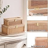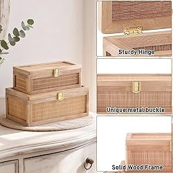 [Natural Material & Versatile Style] Crafted with a solid wood frame and natural bamboo weaving, this keepsake box set features a bohemian, minimalist rustic design that blends seamlessly with both modern and traditional home decor. Each memory box showcases the unique texture of natural materials, adding a warm, organic touch to any space. [Sturdy Construction & Dust-Proof Protection] Built for long-lasting use, these memory boxes for keepsakes boast a sturdy, durable structure that resists wear and tear. The keepsake box equipped with a sleek golden latch lock, the hinged lid keeps dust out and secures your precious items, offering both practicality and a touch of elegance. [2-Piece Set With Multi-Purpose Storage] This 2-piece keepsake box set includes two sizes for flexible organization: Large (12" x 6.6" x 4.7") and Small (10.5" x 4.5" x 3.65"). The multi-purpose design is perfect for storing trinket, photos, keepsake cards, crafts, letters, and other small treasures, keeping your belongings tidy and accessible. [Ideal For Cherished Memories] More than just storage, these memory boxes are designed to preserve life’s most precious moments. Use the baby keepsake box to store your little one’s growth mementos, the wedding keepsake box for bridal souvenirs, or both to safeguard vintage photos and memorial cards—turning everyday items into timeless keepsakes. [Perfect Gift For Every Occasion] This elegant keepsake box set makes a thoughtful, heartfelt gift for family, friends, and loved ones. Whether for birthdays, anniversaries, housewarmings, Thanksgiving, Christmas, weddings and other occasions, it’s a meaningful present that lets them store and cherish their own memories, making it a timeless gift for keepsakes.