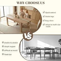 [54–85" Expandable Size]:This extendable dining table expands from 54" to 85", working as a compact kitchen table for daily meals and a full-size expandable dining room table for 4-10 people for holidays, hosting, and family gatherings. [Stable & Supportive Build]:Built for everyday use, this rectangular dining table is designed to feel steady in both closed and extended modes, making it a reliable expandable dining table for dining, serving, and entertaining. [Scratch & Spill ResistantZ]:The tabletop is made for real life—scratch-resistant, spill-resistant, and easy to wipe clean, helping this modern dining table hold up to daily dining and routine household use. [Easy Extend, Easy Care]:Smooth extension and simple daily maintenance make this extendable kitchen table convenient for busy homes—great for quick weeknight dinners and last-minute guests. [95" Runner Included]:Includes a 95-inch table runner to style the table at both lengths and elevate everyday dining or entertaining. This modern rectangular dining table comes in multiple finishes such as Black / Natural / Walnut (varies by option).