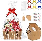 Complete Empty Gift Basket Kit: This set includes 6 empty kraft gift baskets, 6 clear cellophane bags, 6 pull bows(red, blue, gold), 6 gift tags with hanging ropes, and 6 best wishes greeting cards. This set provides everything needed to create stunning, personalized gifts for any occasion Spacious & Practical Design: Generously sized to hold more gifts! Each baskets for gifts measures 27 x 18 cm at the top, 23.5 x 16 cm at the base, and 13cm deep. The roomy interior ensures ample space for treats, goodies, or flowers, please check dimensions to guarantee a perfect fit for your gifts Durable & Stylish Construction: Crafted from heavy-duty kraft cardboard with reinforced handles, these gift baskets bulk will hold your gifts stably without tearing. Decorate with markers, stickers, or handwritten notes for a unique touch, then secure with bows and tags for a delicate finish. Durable & Stylish Construction: Crafted from heavy-duty kraft cardboard with reinforced handles, these baskets and wrap bags will hold your gifts stably without tearing. Decorate with markers, stickers, or handwritten notes for a unique touch, then secure with bows and tags for a delicate finish. Multi-Functional & Reusable: The foldable design allows for compact storage when not in use. Use as a standalone decorative basket, wrap with clear cellophane bags for a beautiful finish, or repurpose as a storage solution