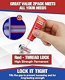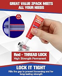 Lock Tight Screws Threadlocker: Thread locker has strong adhesion and can fix screws, nuts, and metal fasteners to prevent loosening due to vibration Value 2 Pack 6ml Red Threadlocker: :Two 6ml bottles red threadlocker provides High-strength (Permanent) bonding, ideal for securing bolts, nuts, and screws in automotive, machinery, and DIY projects. Permanent Locking & Easy Disassembly: Both blue & red threadlocker can permanently lock tite fasteners due to their stable chemical properties. red threadlocker require heating due to their high disassembly torque to be disassembled with tools, while blue threadlocker can be disassembled with tools at any time. Prevents Rusting / Corrosion / Leakage: Unique anaerobic solidification function of flowing liquid ensures tight contact and perfect sealing of bolts & nuts. Avoid the additional cost of purchasing various specifications of washers and traditional locking screws. Easy to use: Simply apply the threadlocker evenly to the thread, tighten the nut, and cure initially for 10-20 minutes, then fully cure within 24 hours