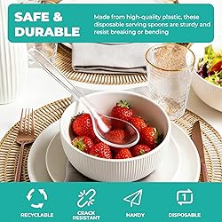 【Sturdy and Durable】Crafted from premium and heavy-duty plastic, these plastic serving utensils are engineered to not easy bending and breaking even when serving dense foods like pasta or cold salads. They are no unwanted plastic taste is transferred to your food, offering a safe and clean serving experience every time. 【Ergonomic Design】The plastic serving spoons are designed with wider, contoured handles that distribute pressure evenly across your palm, significantly reducing hand fatigue during prolonged use. This ergonomic focus makes them ideal for extended use. 【Large Capacity for Efficient Serving】Our disposable serving spoons feature a deep bowl design, allowing you to hold more soup, sauce, or food than standard plastic spoons. This enhanced capacity, combined with the sturdy build, ensures efficient and hassle-free serving for your guests. 【12-Piece Value Pack】This serving utensils set includes you need for any gathering: 12 Heavy-Duty Serving Spoons (9.84") . This versatile assortment meet the need to purchase multiple packs, making it the perfect all-in-one solution. Their compact size allows for easy storage and portability, ready to be grabbed for any occasion. 【Disposable Design for Any Occasion】Designed with durability in mind, these utensils are thick enough to be gently hand-washed and reused, offering other value beyond disposable use. Whether you're hosting a large catered event, a backyard birthday party, a picnic, or need sturdy cutlery for buffet, this set handles it all. They provide the perfect balance of disposable convenience and reusable, ensuring you're always prepared for celebrations.
