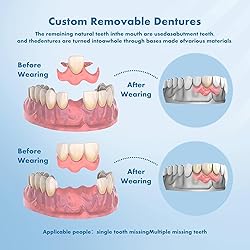CUSTOMIZATION: Personalized partial dentures crafted to fit your specific tooth gaps, providing a natural-looking replacement solution COVERAGE OPTIONS: Flexible design accommodates single or multiple adjacent missing teeth with precise color matching.Choose Your Quantities(1- 6 Teeth Options) REMOVABLE DESIGN: Easy-to-removable appliance that can be taken out for cleaning and maintenance as needed COMFORTABLE FIT: Custom-molded structure ensures secure placement and comfortable wear during eating and speaking STORAGE INCLUDED: Comes with a dedicated storage case to maintain hygiene and protect dentures when not in use