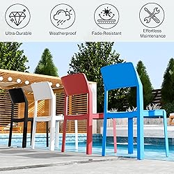 • Why Choose VECELO Stackable Dining Chairs Set of 4? 1. Advanced UV protection maintains color vibrancy2. Thoughtful design combines comfort with space efficiency3. Slatted seat = better drainage than solid plastic chairs4. Lighter weight for easy moving (but still ultra-stable)5. Commercial-grade durability for home or business use6. 100% plastic construction = 100% rust-proof Specifications: Design & ColorsColor Options: Black / White / Red / Blue / GreyMaterial: High-quality plasticDimensionsOverall Size (L × W × H): 21.6” × 18.1” × 31.9”Seat-to-Floor Height: 18.1” (standard chair height)Seating Space: 16.5” × 16.5” (spacious square seat)Durability & CapacityWeight Capacity: 250 lbs per chairFrame/Base: Reinforced plastic for stability
