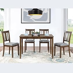 【Rustic Farmhouse Dining Table Set】Classic dining table design with a spacious rectangular table surface and elongated tapered base legs, and has a simple layout that blends power and softness for an attractive appearance. Its large tabletops and comfortable seats will surely provide every diner with a wonderful dining experience. 【Solid Wood Dining Table Set for 4】 This dining table set comes with a table and 4 chairs, which occupy only a small area in your house to fulfill the everyday dining needs of the whole family. It can comfortably accommodate four people, and the armless chairs can be completely folded under the table, making it ideal for small kitchens, apartments, or cozy dining nooks. 【Trusted Quality】The dining table top is made of high quality MDF and birch veneer with a smooth surface that is easy to clean. The frame and legs are made of high quality solid wood, which is durable and hardwearing to ensure a long service life. The 4 chairs are upholstered to provide a comfortable seating experience, allowing you to relax and enjoy your meal. 【Comfortable Upholstered Chairs】This 5 piece dining set includes 4 padded dining chairs. The seats are upholstered in linen fabric and filled with soft padding, offering both comfort and style. The openwork slatted backrests provide ergonomic support, allowing you to enjoy a stable and comfortable dining experience. 【Assembly and Dimensions】This dining table set comes with detailed instructions that can be followed step by step to help you complete the assembly as quickly as possible. The dining table set for 4 will arrive in 2 parts and may on different days. Table: 45.5”L x 28.5”W x 30”H; Chair: 17”W x 20”D x 36”H.
