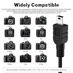 Compatible: UC-E4 USB cable for Nikon compatible with Nikon DSLR UC-E4/UC-E5/UC-E15/UC-E19 D600 D610 D7000 D3 D3 D3S D4 D4S D300S D3000 D3100 D3X D90 D700 D60 D300 D40X D40 D80 D2Xs D200 D50 D70s D2Hs D2X D70 D2H D100, also compatible with Nikon 1 AW1, 1 S1, 1 V2, 1 J1, 1 J2, 1 J3 cameras, and more High-Speed Stable Transmission: The UC-E4 USB cable features built-in oxygen-free copper cores supporting data transfer rates up to 480Mbps. Magnetic rings, foil shielding, and braided shielding layers effectively reduce electromagnetic interference/radio frequency interference, ensuring smooth transmission of high-definition photos and videos Durable Materials: The PVC outer jacket combines abrasion resistance with flexibility, while aluminum connectors provide superior conductivity and corrosion resistance. Reinforced connectors withstand over 20,000 bend cycles for extended longevity Dual Functionality: The UC-E15 USB cable connects cameras to computers/laptops for photo/video transfer or pairs with a USB adapter for battery charging, supporting 5V/500mA fast charging (Please verify camera USB charging compatibility beforehand) User-Friendly Design: No drivers required—devices automatically recognize the cable upon connection, saving setup time. Available in 1.5m/1m lengths with foldable storage, enabling convenient connections for photo transfers or charging in homes, offices, studios, and more