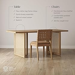 • Elevate your dining space with the Willow rattan boho dining table set, a beautiful balance of natural texture and modern comfort. Designed to seat four, this inviting set is perfect for everyday dining. The dining table features a solid wood base construction paired with natural light brown wood veneer finish and faux rattan inlays along the leg frame - adding a subtle texture and relaxed boho touch while maintaining a clean, refined silhouette. The table can seat up to six. The matching dining chairs (set of 6) are crafted with solid wood frames and a comfortable 19-inch seat height, offering reliable support and an easy dining experience. A woven faux leather back adds visual interest and durability, while the faux leather seat cushion provides a firm yet comfortable support. Quick and easy assembly - the Willow dining set is designed for convenience without sacrificing quality and style. Nathan James is the furniture company built for this generation. You don't need to spend a fortune to get quality design-first furniture and when we say easy assembly, we mean it. This product is not recommended for commercial use. Materials: -MDF -Pine wood/Rubberwood -Rubberwood Veneer -Plastic Rattan -Foam -PU Leather -Plywood Assembly Must-Haves: - Packaging carton as working surface Weight Limit: - Table = 110 lbs - Dining chair = 300 lbs each