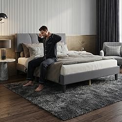 [Noise-reduction Technology] Specially designed solid wood sound dampening strips minimize motion transfer and reduce squeaking noises for undisturbed sleep. the carefully engineered structure enhances overall comfort while improving the bed's durability, making it an ideal choice for couples or individuals who value peaceful rest. [Elegant Design & Premium Materials] This queen size platform bed frame showcases a timeless dark gray finish with sophisticated european styling, effortlessly elevating the aesthetic of any bedroom. crafted from rubber wood and mdf, the sturdy construction ensures long-lasting durability while the fine linen upholstery adds a touch of luxury. [Quick & Easy Assembly] The innovative touch fastener snap system connects bed slats effortlessly for reduced noise and vibration. all necessary parts and tools come conveniently packaged with clear instructions, allowing you to assemble this sturdy bed frame in just 30 minutes without any professional help. [Spacious & Comfortable Design] Measuring 81.5x61.42x42.13 inches, this bed frame accommodates standard 80x60 inch mattresses with ease. the 10.83-inch high bed legs provide ample under-bed storage space, while the adjustable 19.69/31.1-inch high headboard offers customizable comfort for reading or relaxing in bed. [Unmatched Stability & Support] Featuring 12 sturdy legs and robust wooden beams, this platform bed frame delivers superior support for your mattress. the reinforced structure can support up to 800 lbs, ensuring exceptional stability for years of restful sleep. evenly spaced wooden slats prevent mattress sagging while the non-slip design keeps your mattress securely in place.