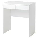 HIDDEN MIRROR & ORGANIZED STORAGE: Hinged lid reveals a built-in mirror and concealed compartments, helping keep makeup, jewelry, and accessories neatly stored and out of sight. COMPACT SIZE FOR SMALL SPACES: Measures 27.5 x 16.5 x 30.4 inches, making this white vanity table ideal for bedrooms, apartments, dorms, or limited-space living. MULTI-PURPOSE MODERN DESIGN: Functions as a dressing table, makeup vanity, writing desk, or sideboard and pairs easily with other furniture in the same series. SMOOTH DRAWER WITH SAFETY STOPS: Storage drawer includes built-in stops to prevent over-pulling, ensuring stability and convenient everyday use. DURABLE MATERIALS & EASY CARE: Made from quality particleboard with plastic edging and a glass mirror; wipes clean easily with a damp cloth for low-maintenance upkeep.