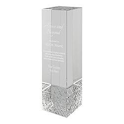 These awards make the perfect gifts to show your appreciation to your employees for their achievements! They are engraved on a per order basis using state of the art laser engraving technology to create a crisp, permanent engraving of the highest quality. Made from over 4 lbs of heavy duty, solid optical crystal. Each award comes in a beautiful blue satin lined gift box. Polished finish with a textured jewel patterned base. This gorgeous award is ready to be displayed and is sure to be a cherished gift. Engraved on one side. Engraving comes out frosted white. Dimensions : 8.75" x 2.5" x 2.5"