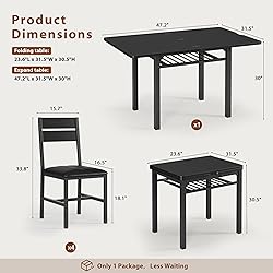 • Our 5 Piece Dining Table Set for 4 features an extendable kitchen table and 4 upholstered dining room chairs, making it a perfect choice for small spaces, apartments, and kitchens. The wood kitchen table with built-in storage rack offers both functionality and organization, while PU leather chairs provide comfortable seating for everyday dining. A space-saving dining set that blends comfort, stability, and rustic style for modern homes.Space-Saving 5 Piece Dining Set for 4 - Designed with compact living in mind, this 5 Piece Dining table set helps keep your dining area open and uncluttered, making it an ideal choice for apartments, breakfast nooks, kitchens, and small dining spaces. Built-In Storage Rack Keeps Everything Organized - The built-in storage rack beneath the table offers a practical solution for storing placemats, tableware, or frequently used kitchen essentials.Sturdy Wood Table with Stable Steel Frame - The solid construction ensures the table stays steady during daily use, providing reliable support for meals, gatherings, and everyday life. Specifications:1. Color: Black2. Material: Particleboard & Steel Frame3. Dimension: Folding table: 23.6"L x 31.5"W x 30.5"H Expand table: 47.2"L x 31.5"W x 30"HChairs: 15.7"L x 16.5"W x 33.8"H4. Packaging Size: 37.4"L(95cm) x 26.7"W(68cm) x 11.8"H(30cm)5. Net Weight: 81 LBS6. Gross Weight: 89 LBS Package Includes:1 x Table and chairs set of 41 x Assembly kit1 x Instructions