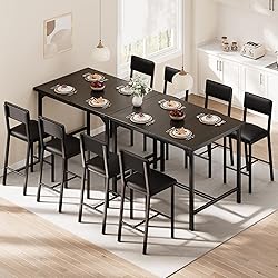 - This stylish dining table set for 4 features a spacious, durable wood-grain table with metal corner protectors and 4 comfy PU leather stools with ergonomic backrests and footrests. Its sturdy steel H-frame ensures stability, while the compact design saves space—easy to assemble and perfect for any modern home.