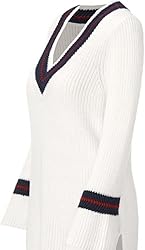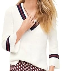 - Color: Tennis White trimmed with Navy/Red Material: 77% Cotton; 22% Nylon; 1% Other Fabrics Bell Sleeves Side slits Deep V Neckline (to show off your favorite necklace)