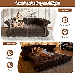 Handcrafted Floral Tufting Design: This modern sleeper sofa bed queen perfectly blends art and comfort with its unique hand-stitched floral design. Each flower, meticulously crafted by skilled artisans, varies in size, giving the livingroom sofa cama a vibrant three-dimensional feel. The soft floral details replace traditional metal buttons for a more comfortable touch, adding romance and warmth to the queen size pull-out sofa bed 2-in-1 Convertible Sleeper: This versatile pull-out couch offers effortless convenience with its functional design. It quickly transforms into a near-queen size sleeper sofa bed (77.6''L x 60.6''W) by simply pulling out the hidden bed frame and adding the cushions. Its multifunctional design makes it ideal for a home office, providing a cozy spot for breaks or meetings while easily converting into a spacious sleeper bed for overnight guests Timeless Elegance:This versatile daybed queen features an elegant design that blends Chesterfield style with modern medieval elements. Its deep-stitched detailing on the backrest, seat, and s-shaped armrests showcases exceptional craftsmanship and a soft, three-dimensional texture. The s-shaped armrests enhance its sophistication, making this cozy sleeper couch bed both functional and a work of art. Suitable for vintage, modern, or minimalist styles, it adds unique charm to any living space Ultimate Comfort: This king-size deep seat couch with a pull-out bed is made from high-quality velvet fabric, offering a luxurious and soft touch while exuding warmth. With a seat height of 18.1'' and a seat depth of 26'', it provides ample space for comfort. Filled with high-resilience foam, it offers excellent support and retains its shape over time. Two removable throw pillows add visual appeal and extra support, making cleaning easy and allowing for customizable seating arrangements Durable & Sturdy: This futon sofa bed queen features a high-density solid wood frame for exceptional stability and durability. Its design prevents sagging, deformation, or wobbling, providing reliable support for everyday use. Each seat supports up to 300 pounds, accommodating all body types. Measuring 83.8''Lx32.7''Wx34.6''H, this stylish sleeper sofa effortlessly meets your home’s needs, offering both luxurious comfort and unmatched stability, making it a perfect addition to any living space.