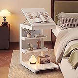Byroce C Shaped End Table, Rolling Side Table with Adjustable Desktop, 4 Lockable Wheels, Storage Shelves & Edge Stopper, Modern Couch Tray Table for Sofa, TV, Living Room, Bedroom & Office (White)