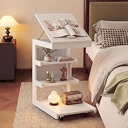 • Description:Designed for modern living, this C-shaped rolling end table brings flexibility, comfort, and smart storage into one compact solution. With a 3-angle tiltable desktop (27°/39°/45°), it allows you to read, write, or work on your laptop at the most comfortable angle, while the built-in edge stopper keeps items securely in place.Moreover, the table offers ample storage space. Open 3-tier shelves neatly organize books, décor, or plants, while a side storage pocket and hidden tabletop compartment keep office supplies and remotes within easy reach.Thanks to 4 smooth-rolling lockable casters, the table moves effortlessly across different floors and stays firmly in position when needed. Crafted from solid rubber wood, it ensures lasting stability, a splinter-free surface, and rounded corners for added safety.Lastly, its space-saving C-shaped design slides easily under sofas, beds, or couches, making it a perfect companion for living rooms, bedrooms, offices, or small apartments.Features:3-angle tiltable desktop (27°/39°/45°) offers ergonomic comfort for reading, writing, or laptop useBuilt-in edge stopper keeps laptops, books, and papers securely in place while workingC-shaped design slides easily under sofas, couches, and beds to save floor spaceSmooth-rolling side table with four universal casters moves effortlessly across different floor surfacesAll four wheels are lockable to ensure stable positioning during work or relaxationThree-tier open storage shelves provide organized space for books, décor, and daily essentialsAdditional storage pocket and hidden tabletop compartment keep small items within easy reachSolid rubber wood construction delivers enhanced durability, strength, and long-term stabilitySplinter-free surface and rounded corners improve safety and user comfort for daily useModern minimalist style blends seamlessly with living rooms, bedrooms, offices, and apartmentsCompact yet functional design works perfectly as a sofa tray, side table, or mobile workstationEasy-to-follow instructions allow quick assembly without professional tools or experienceSpecification:Color: Brown/Natural/WhiteMaterial: Rubber Wood, MDF, Engineered Wood, FabricOverall Dimensions: 22.5'' x 16'' x 27.5'' (L x W x H)Tabletop Size: 19'' x 16'' (L x W)Hidden Compartment Size: 15.5'' x 14'' x 1.5'' (L x W x H)Second Tier Size: 14'' x 5'' (L x W)Space Between Shelves: 6''Third Tier Size: 14'' x 6.5'' (L x W)Bottom Shelf Size: 14'' x 19'' (L x W)Base Height: 4''Total Weight Capacity: 210 lbsWeight Capacity of Top: 110 lbsNet Weight: 20 lbsPackage Includes:1 x Rolling C-shaped End Table1 x User Manual
