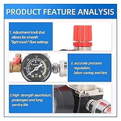 [Easy Installation] With its compact lightweight design and straightforward mounting system this pressure controller can be installed in minutes. the space-saving profile fits perfectly in areas while remaining easily accessible for adjustments during operation. [Versatile Connectivity] Engineered with 3 durable 1/4 inch ports and 1 convenient 1/8 inch instrument port this pressure regulator ensures secure airtight connections for multiple air lines. the robust cast iron construction prevents leaks while maintaining stability during operation. [Reliable Performance] Designed for this regulator delivers consistent gas regulation and accurate pressure measurement. the heavy-duty construction maintains under continuous use ensuring dependable operation in demanding industrial environments. [User-friendly Design] The oversized plastic adjustment knob provides exceptional grip and control enabling smooth airflow adjustments even when wearing work gloves. its ergonomic design reduces hand fatigue during prolonged use making it ideal for professional workshops. [Precise Pressure Control] This air compressor regulator features a highly responsive 0180 psi dial that allows for pinpoint accuracy when adjusting pressure levels. the smooth turning knob makes fine-tuning effortless whether youre working with delicate instruments or heavy-duty pneumatic tools.