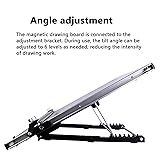 A2 Drawing Platform: This Magnetic Drawing Board features an ergonomic design with an aluminum alloy composite ruler that offers automatic 1-2mm lift and smooth parallel movement for clean, precise drawings. 6-Level Tilt Angle: The Adjustable Angle Drawing Board provides six tilt settings to promote healthy posture, reducing neck strain during extended use for artists. Secure Locking Mechanism: Adjust the left side knob for quick release and locking, while the right side allows for +/- 20-degree ruler angle adjustments, enhancing versatility. Metric Magnetic Drawing Board: With a clearly marked sliding ruler, this board features inch markings and equidistant lines for accurate guidance. The magnetic surface secures paper without pins or tape. Professional Portable Design: This Adjustable Drafting Tool is ideal for architects, artists, and engineers, featuring parallel bars for accurate pressure application. Lightweight and portable for various drawing applications.