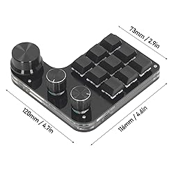 - 1. Keypad Structure: Custom mini mechanical keypad with 9 keys and 3 control knobs, with dust proof red switch and RGB LED, supporting keypad programming macro and software. 2. Custom Functions: This mini keypad supports zooming in, out, copying, pasting, selecting all, cutting, gaming, office, music, media, industrial control, etc. 3. USB C Connection: This keypad supports USB C connection. Connect the USB cable to the computer, download the software, select the function you want, and click download after setting up. 4. Setting Storage: The keypad has dedicated setting program that can be repeated, onboard storage, the setting is kept in the keypad, do not need to be reset when replacing the device. 5. Convenient Use: This custom mini keypad is compact and practical, which is perfect for home entertainment, office, gaming, and other scenes, equipped with data cable and foot pads. Spec: Item Type: Mini Mechanical Keypad Keypad Switch: Dust proof Red Switch Material: ABS, Acrylic, Metal Operating Voltage: 5V 1A Connection: USB C Cable How to Use: Follow the instructions manual PackageList: 1 x Mini Keypad 1 x Data Cable 6 x Foot Pads