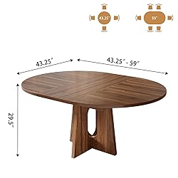 43"-59" Expandable Round Table: Easily transforms from a cozy 59-inch round table to a spacious oval shape. Perfect for daily meals or hosting guests, offering flexible seating for 4 to 6 people without wasting space Unshakable Stability & Support: Built with a massive cross pedestal base that eliminates wobbling. This incredibly sturdy foundation provides superior legroom and supports the table securely at any size Farmhouse Charm for Any Room: Features a beautiful dark brown walnut finish with realistic wood grain texture. This classic farmhouse style adds warm, rustic elegance to your kitchen, dining room, or apartment Sturdy & Easy-Clean Surface: Crafted with a scratch-resistant laminate top. It confidently withstands daily use, heat, and spills, making cleanup a breeze for a family-friendly home Effortless Assembly Included: Everything required for a straightforward setup is in the box. Follow our clear instructions for a hassle-free assembly, and you'll be all set to enjoy your new favorite table in no time
