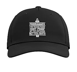 Grab this funny Programmer I Try Make Things Idiot Proof design for your programmer nerd dad, mom, husband, brother, friend or relative! It's the perfect geek gift idea & present for birthday, father's day, mother's day or christmas! This Programmer I Try Make Things Idiot Proof design is perfect for IT professionals, coders, computer engineers, software developers & tech support men women who will proudly wear this information technology, coding, programming, cybersecurity tee Classic five-panel structured baseball hat with high-profile crown Adjustable fit; one size fits most adults
