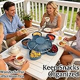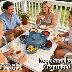 360° Smooth Rotation for Effortless Sharing: Divided Spin and Snack Serving Tray, The rotating design lets guests of all ages easily access snacks from any angle, eliminating the need to pass platters and making parties, movie nights, and family gatherings more enjoyable and interactive Divided Compartments for Organized Serving:Spacious, separate sections keep nuts, fruits, candies, crackers, and appetizers neatly displayed and beautifully separated, creating a clean, inviting, and visually appealing presentation Dual-Use Design for Serving & Storage:Beyond party use, it doubles as a versatile countertop organizer for spices, jewelry, or craft supplies. Its compact flower shape fits perfectly on coffee tables, dining tables, and kitchen islands Durable Construction:Made from sturdy, shatter-resistant material that is safe for direct food contact. Smooth, rounded edges prevent scratches, ensuring long-lasting use and a safe experience for the whole family Elegant & Versatile for Any Occasion:Combining modern style with practicality, this tray elevates both casual and formal hosting