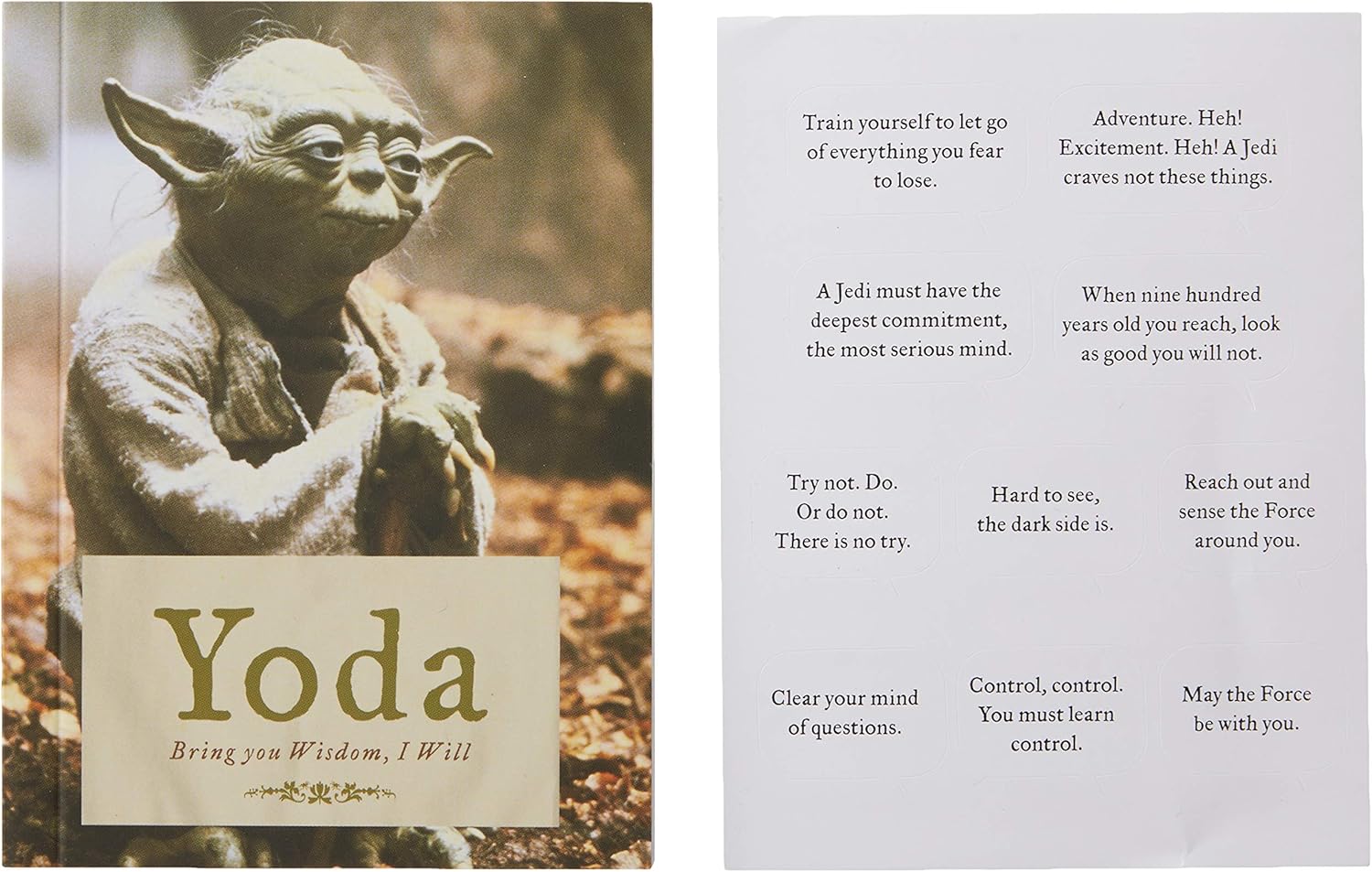 THE ESSENCE OF YODA: Includes a booklet of inspirational quotes, a customizable backdrop, and stickers with select quotes capturing the wisdom and appeal of legendary Yoda.
