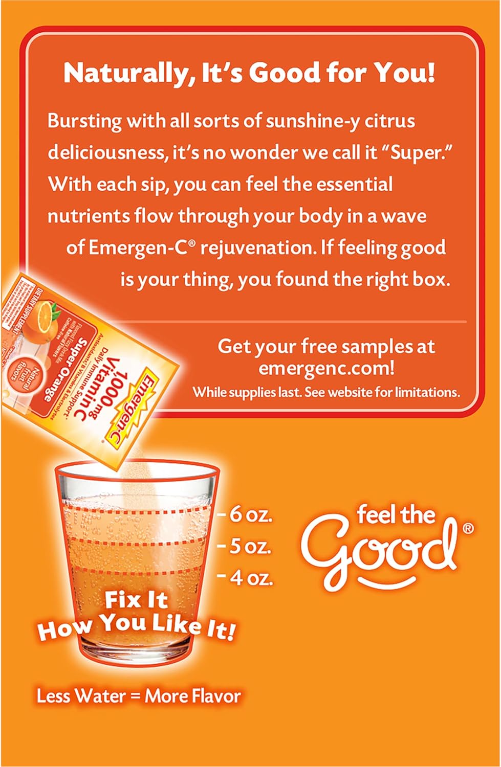 Emergen-C 1000mg Polvo de Vitamina C para Apoyo Inmunológico Diario Sin Cafeína Suplementos de Vitamina C con Zinc y Manganeso, Vitaminas B y Electrolitos, Sabor Super Naranja - 30 Unidades
