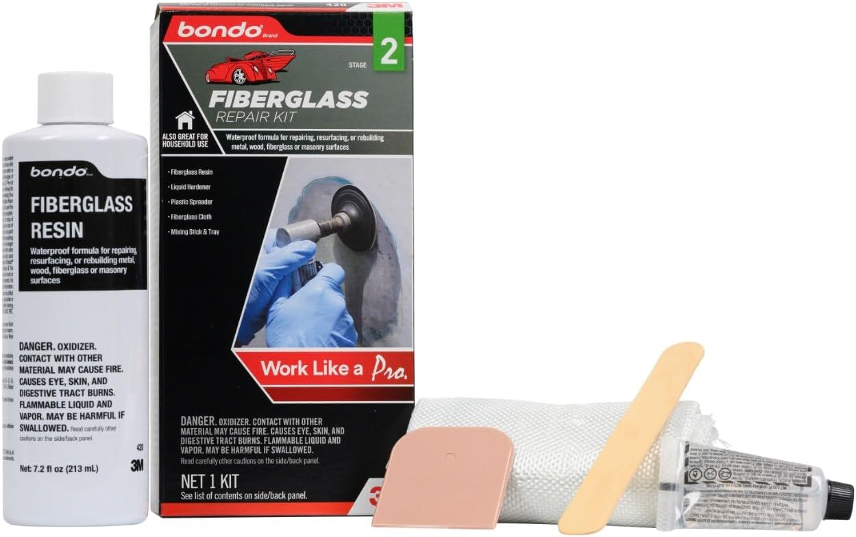 Includes everything that is needed for the DIYer - fiberglass resin, liquid hardener, plastic spreader, fiberglass cloth, mixing stick and mixing tray
