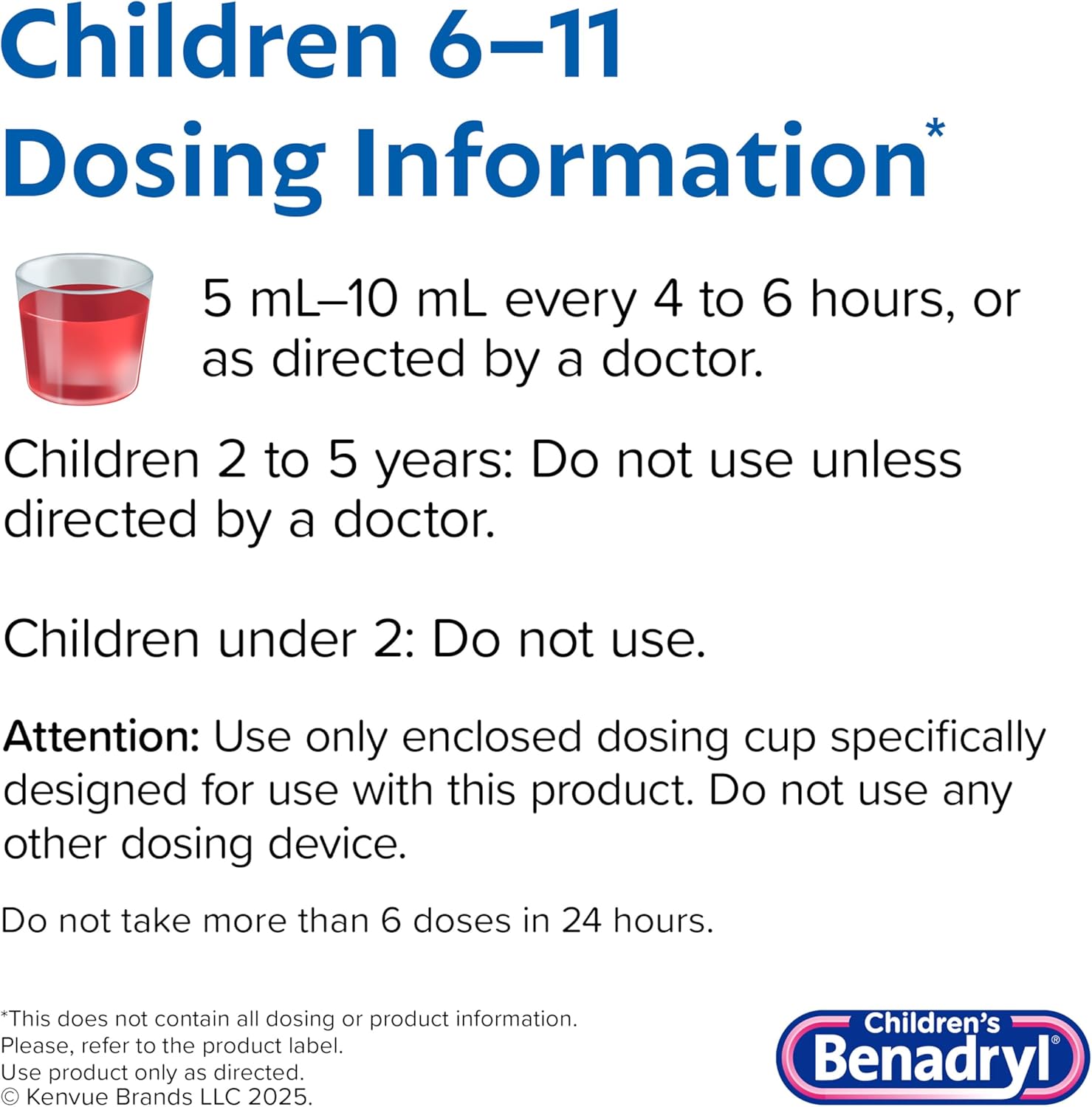 4-fluid ounces of Children's Benadryl Allergy Relief Liquid in a kid-friendly cherry flavor is specially formulated to provide temporary relief of allergy symptoms caused by hay fever and other upper respiratory allergies