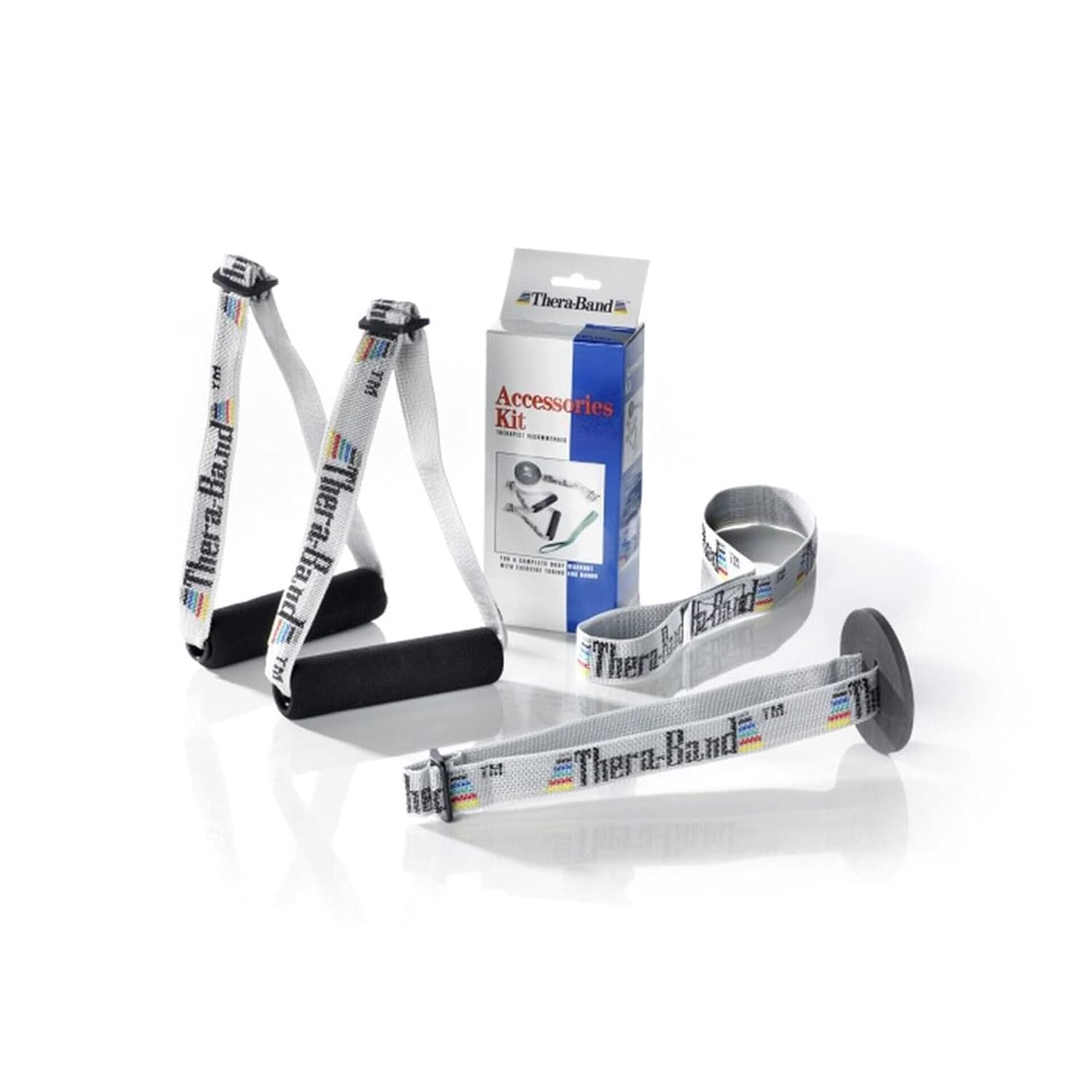 The THERABAND Accessories Kit includes a Door Anchor, Assist Strap and a set of Soft Grip Handles. The Door Anchor allows any door to become an effective workout station. The assist strap provides a secure attachment point for use with Bands. The soft grip handles provide added comfort and versatility with the use of our Non-Latex Bands.
