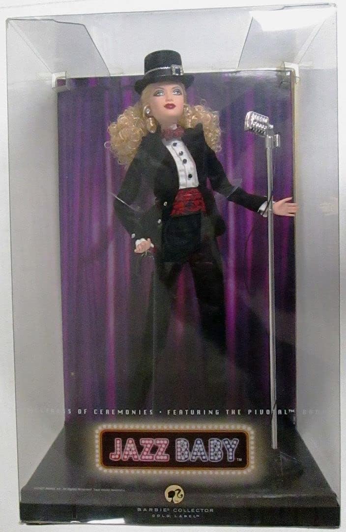 The curtains are drawn. The atmosphere: smoky and dark. There is thrill and anticipation in the air, and dancing that’s nothing short of magical on stage. Cabaret is an exhilarating art, and Jazz Baby Mistress of Ceremonies Barbie doll is perfect in the leading role! Ready to take the stage in a highly theatrical ensemble, this femme fatale-inspired doll wears a sharp black satin tux, sassy hat, bow tie and pointy dancing shoes, with dark, smoky makeup to match the dramatic mood. Featuring the fully posable Pivotal body, with 12 points of articulation!