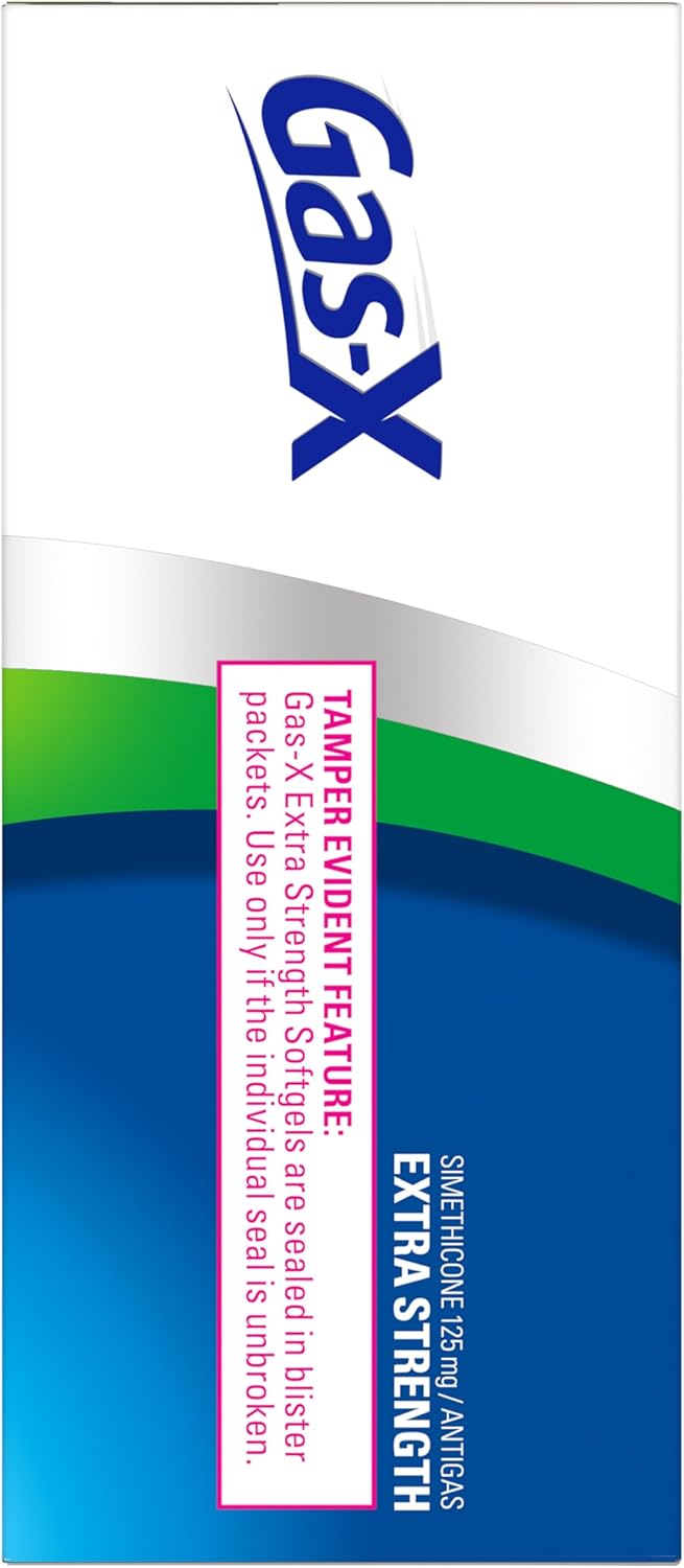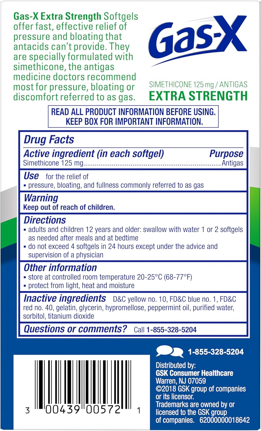 From the number 1 Anti-Gas Relief Brand comes Gas-X Extra Strength Gas Relief Softgels with Simethicone 125 mg deliver fast relief of gas pressure, bloating and discomfort. These simethicone 125 mg softgels go to work in minutes, rescuing you from embarrassing situations and helping you get back to feeling like yourself. Gas-X uses 125 mg simethicone to break up gas bubbles in your stomach and intestines. Once this trapped gas is broken down, your body can deal with the gas properly. These Gas-X Antigas Softgels are portable and easy to take. Adults and children 12 years of age and older may take one or two antigas pills as needed, not to exceed four gas relief pills in 24 hours unless directed by a doctor. Gas-X is the name you turn to when you need serious gas relief. Trust Gas-X, the number 1 doctor recommended OTC anti-gas product.* *ProVoice Survey fielded from March 1, 2020 to February 28, 2021, and recording recommendations for OTC Anti-Gas products