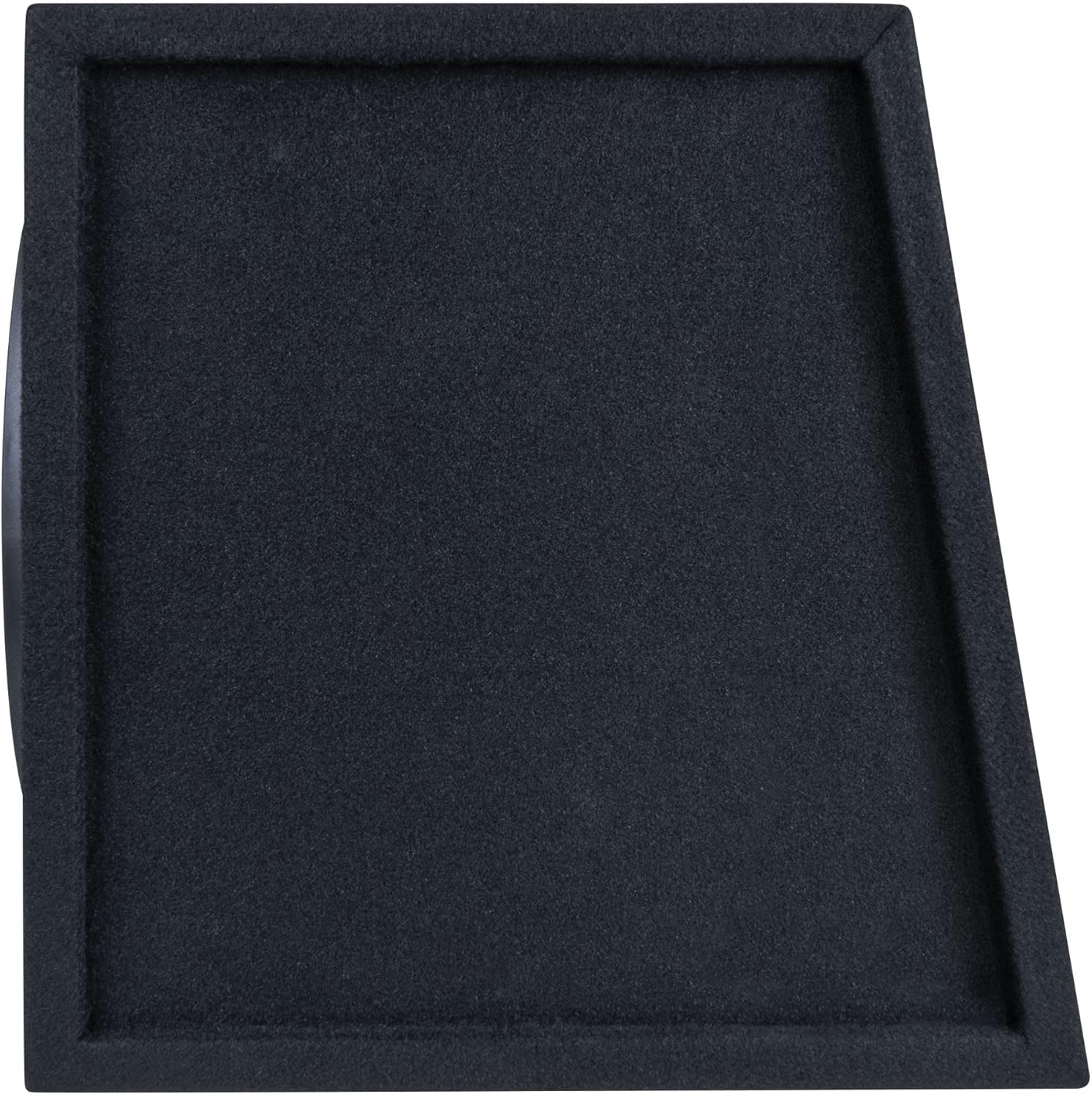 Ensuring speaker durability features a rubber surround and polypropylene cone; Solid 5/8 inch MDF construction, covered in black carpet, keeps your subwoofers securely in place
