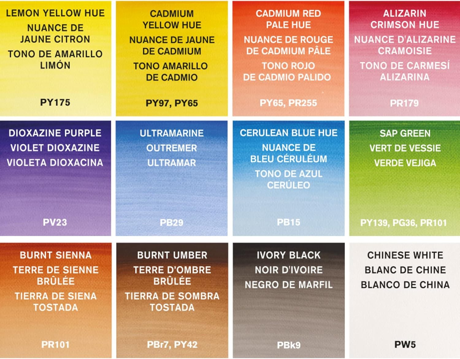 This water colour set contains twelve Cotman Water Colour 8ml tubes: Cadmium Yellow Hue, Cadmium Red Pale Hue, Alizarin Crimson Hue, Ultramarine, Cerulean Blue Hue, Prussian Blue, Viridian Hue, Yellow Ochre, Burnt Sienna, Burnt Umber, Ivory Black, Chinese White.