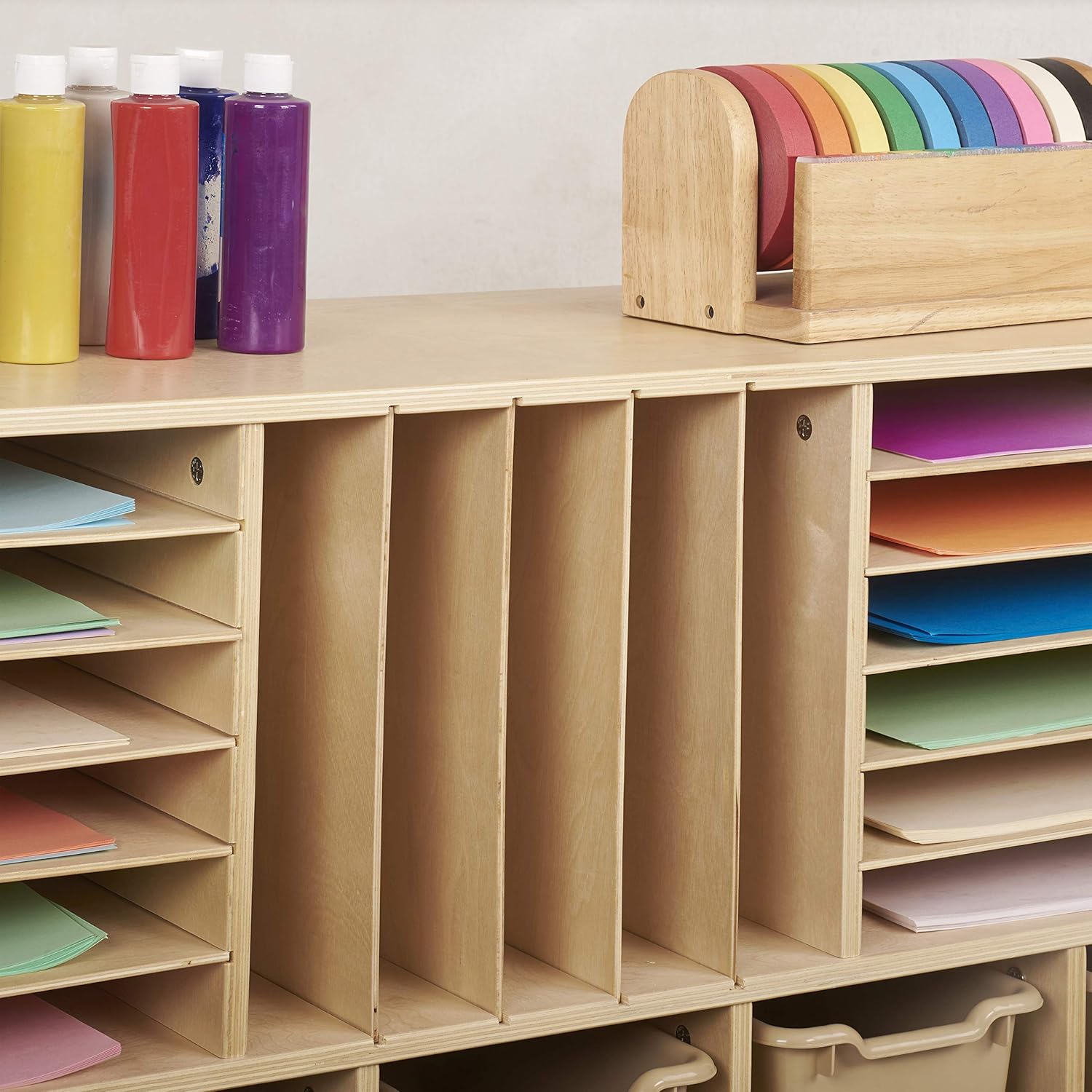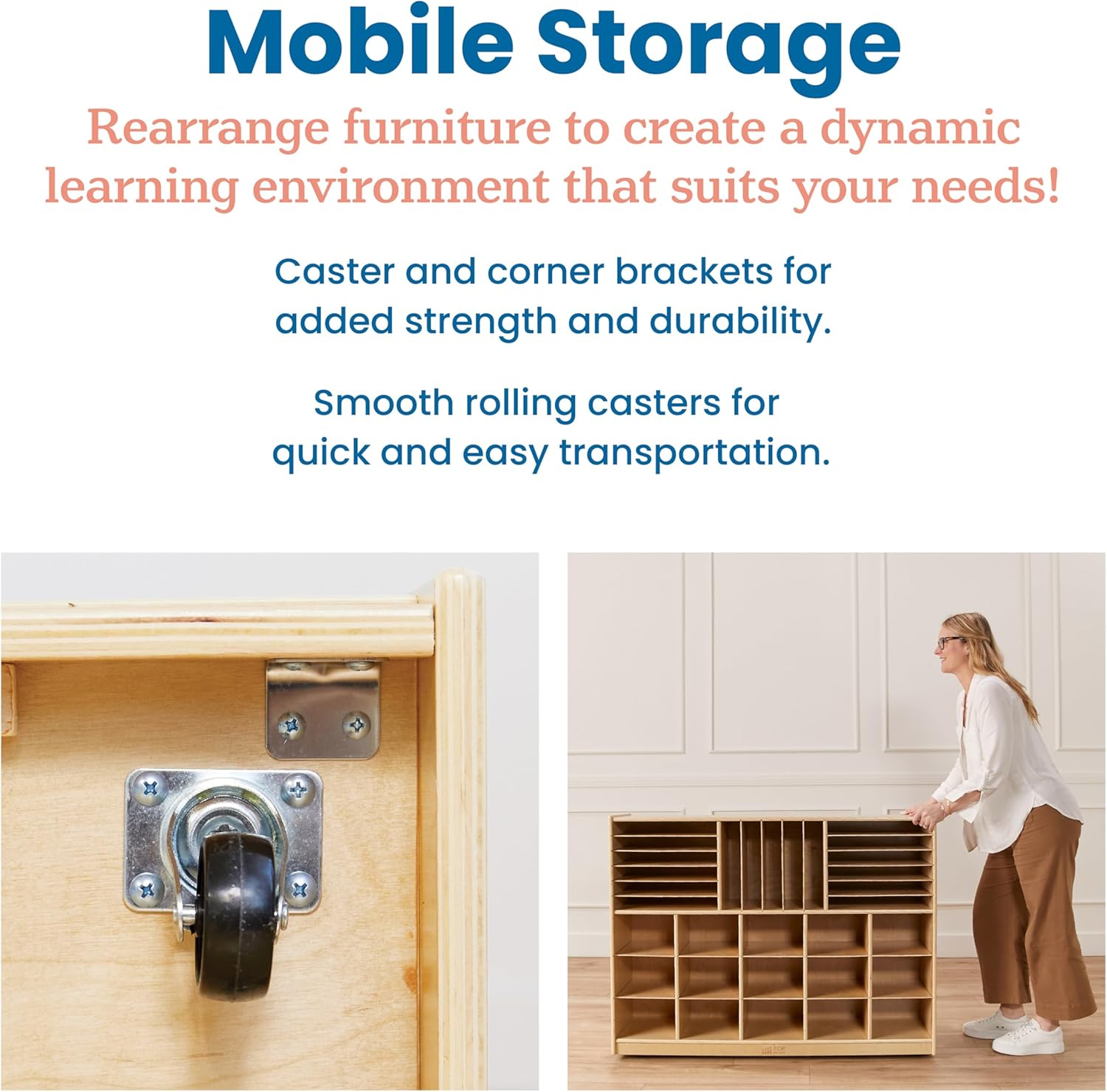 Keep your classroom organized with ECR4Kids Multi-Section Mobile Storage Cabinet with Bins. Kids and adults can organize and store toys, games, building blocks, and school supplies that may otherwise be forgotten. Designed to grow with little ones, this storage cabinet with 15 cubbies, 12 trays, and five slots helps parents, teachers, and educators keep small items within reach. The various sizes of storage slots give children their cubby at school to store homework, art pieces, and other personal items. Durable plastic bins feature rounded edges, an easy-to-grasp scoop front handle, and a curved interior to simply remove contents. Lightweight bins are easy to carry between activities. The low-profile open-face shelves encourage little ones to select their favorite activity independently, introduce organizational skills, and clean up when playtime is over. Four casters are included for mobility; move the storage unit from a hallway to the art room. Constructed from sustainably harvested birch plywood with a durable finish sealing the wood surface and resisting scratching. A UV inhibitor helps furniture resist ultraviolet light and yellowing. Birch plywood is extremely durable and will hold up to everyday use in an early childhood environment.