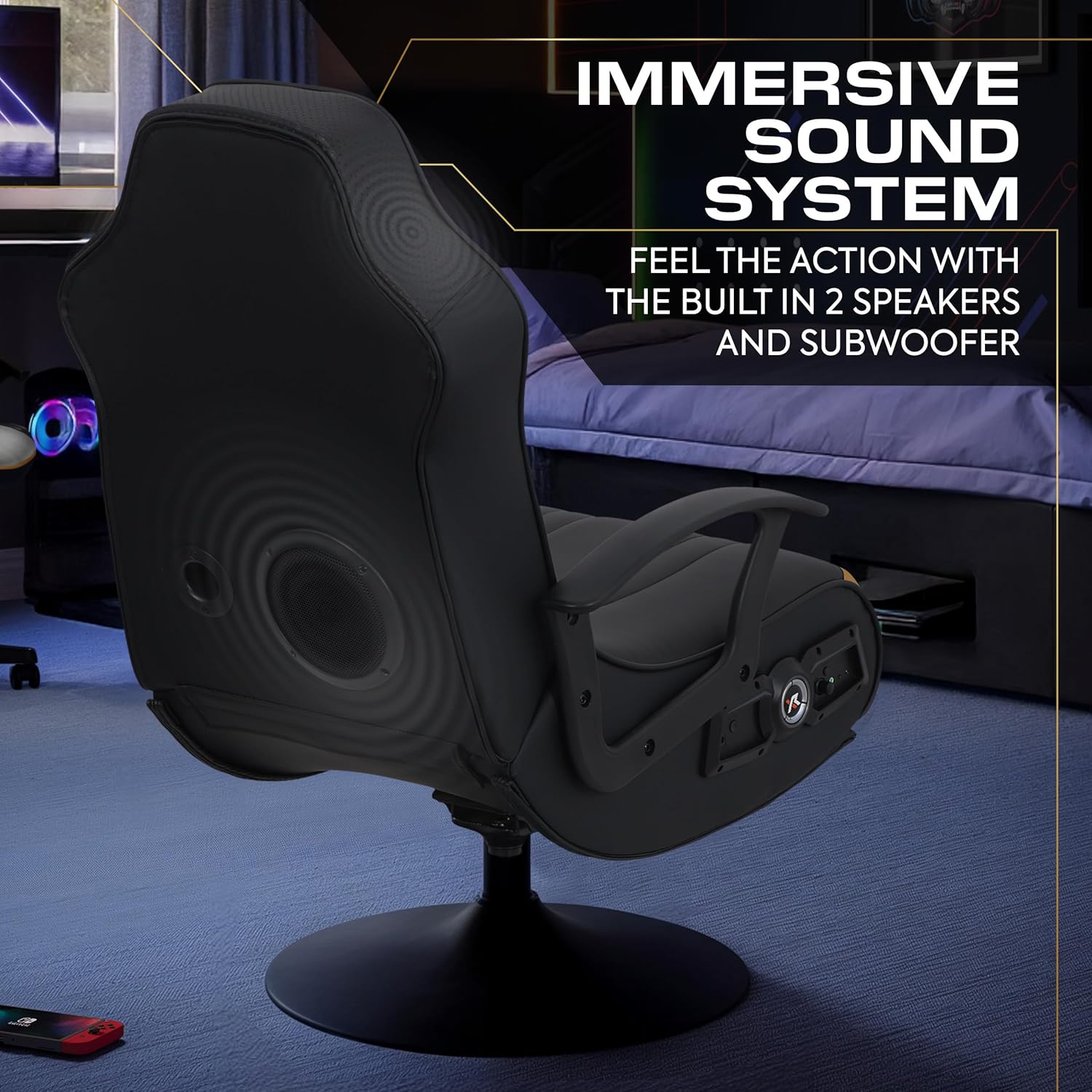 BUILT-IN SOUND SYSTEM | 2 headrest mounted speakers and a huge backrest subwoofer creates maximum, high-quality surround sound audio for an immersive experience with no noticeable latency