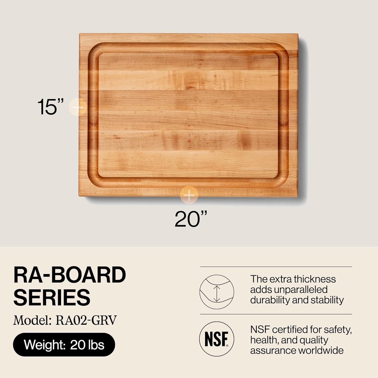 John Boos RA-Board Series Rectangular Wooden Maple Deluxe Barbecue Cutting Board 20”x15” – 2.25” Thick, 20-lb Reversible Butcher Block with Juice Groove, Edge-Grain & Finger Grips – Made in the USA