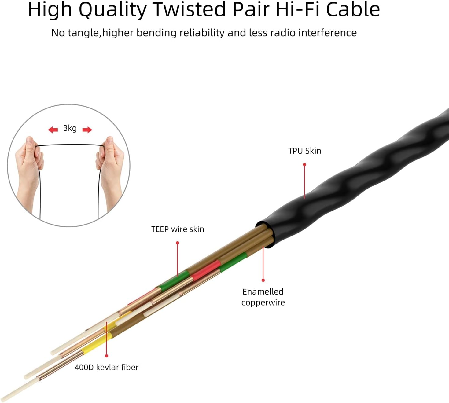 High Quality Twisted Pair Hi-Fi Cable:The twisted core cable not only improves durability, reduces tangle and rejects noise from RF interference, but also obtain high-resolution sound.