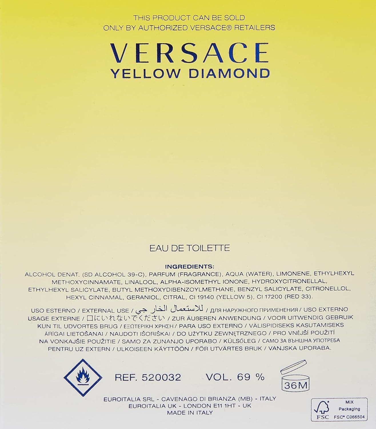 Spray de Eau de Toilette Versace Diamond, Amarillo, 3 Onzas. Un perfume que encanta con su refinamiento mediterráneo de bergamota brillante, limón de Diamante y noble neroli, con la cautivadora adición de irresistibles y atractivos acentos de sorbete de pera. El corazón celebra una feminidad intensa y glamurosa, que se expresa con facetas cremosas y aterciopeladas de pétalos de jazmín y osmanto, junto con preciosas notas de flor de naranja y fresia. El seductor y envolvente fondo es basado en tonos profundos y vibrantes de madera de ámbar y palo santo, enriquecido por las voluptuosas notas de benceno y ámbar seductor y brillante.