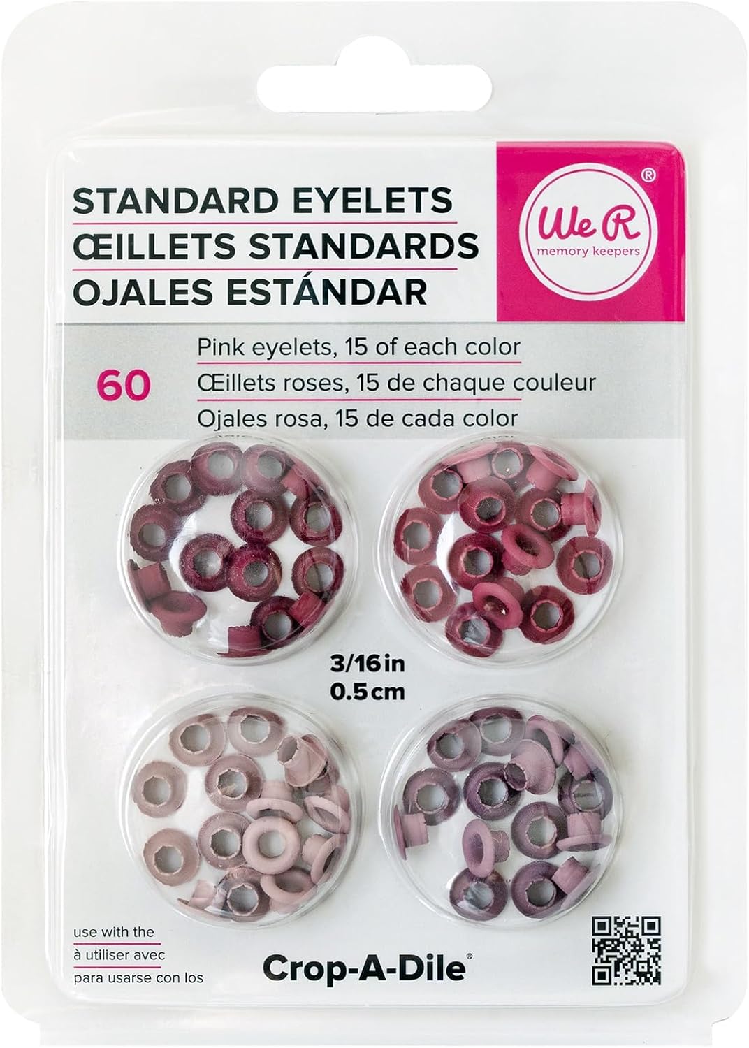 We R Memory Keepers Eyelets are a Great way to Embellish all your Many Projects. There are Over 100 Colors and Several Styles Available including : Standard 1/3 inch head-3/16 inch center and Wide 1/2 inch head-3/16 inch center. Every Pack has 4 different coordinating colors in either Solid or Shimmer Finish.