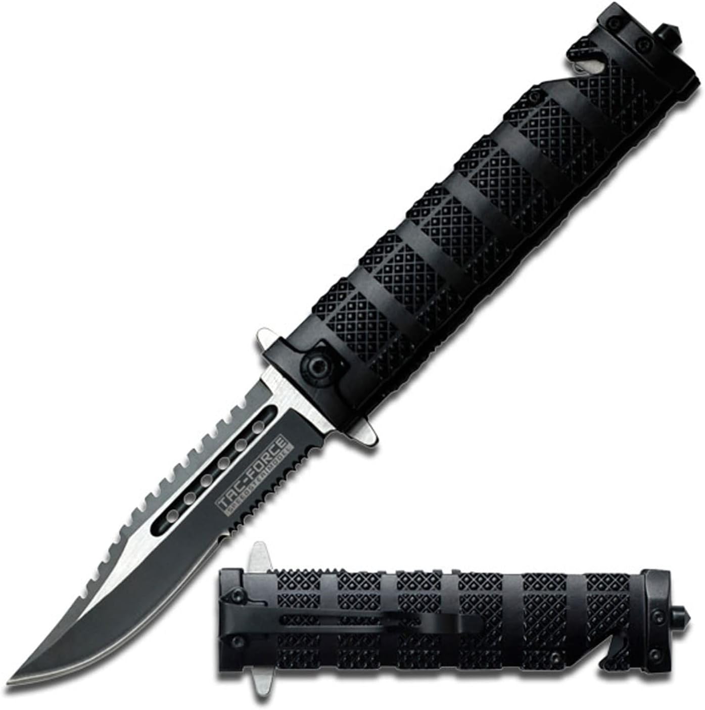The TAC Force Liner Lock Assisted Opening Folding Knife (TF-710 Series) features a two-tone half-serrated blade, with a 5-inch closed length. Offering easy one-handed deployment, this spring assisted open folding knife locks securely into place with the use of its liner lock. This knife features a 3-1/2-inch, 3mm thick stainless steel blade. The aluminum handle features a diamond cut pattern and comes with a seat belt cutter and a glass breaker on the end, which can punch out the window of a car in an emergency. It also has a pocket clip for easy and safe carry. TAC Force designs spring assist folding knives that offer the rapid deployment desired by EMTs, Fire/Rescue, and first responders. They're available in a wide range of styles -- from hunting to tactical and collectibles to fantasy.