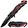 CARACTERÍSTICAS ESPECIALES: Finger Flipper, Clip de Bolsillo, Mango de Aluminio Negro con Acentos Rojos y Medallón de Bombero, Cierre de resorte, Punzón de Vidrio y Cortacables.
