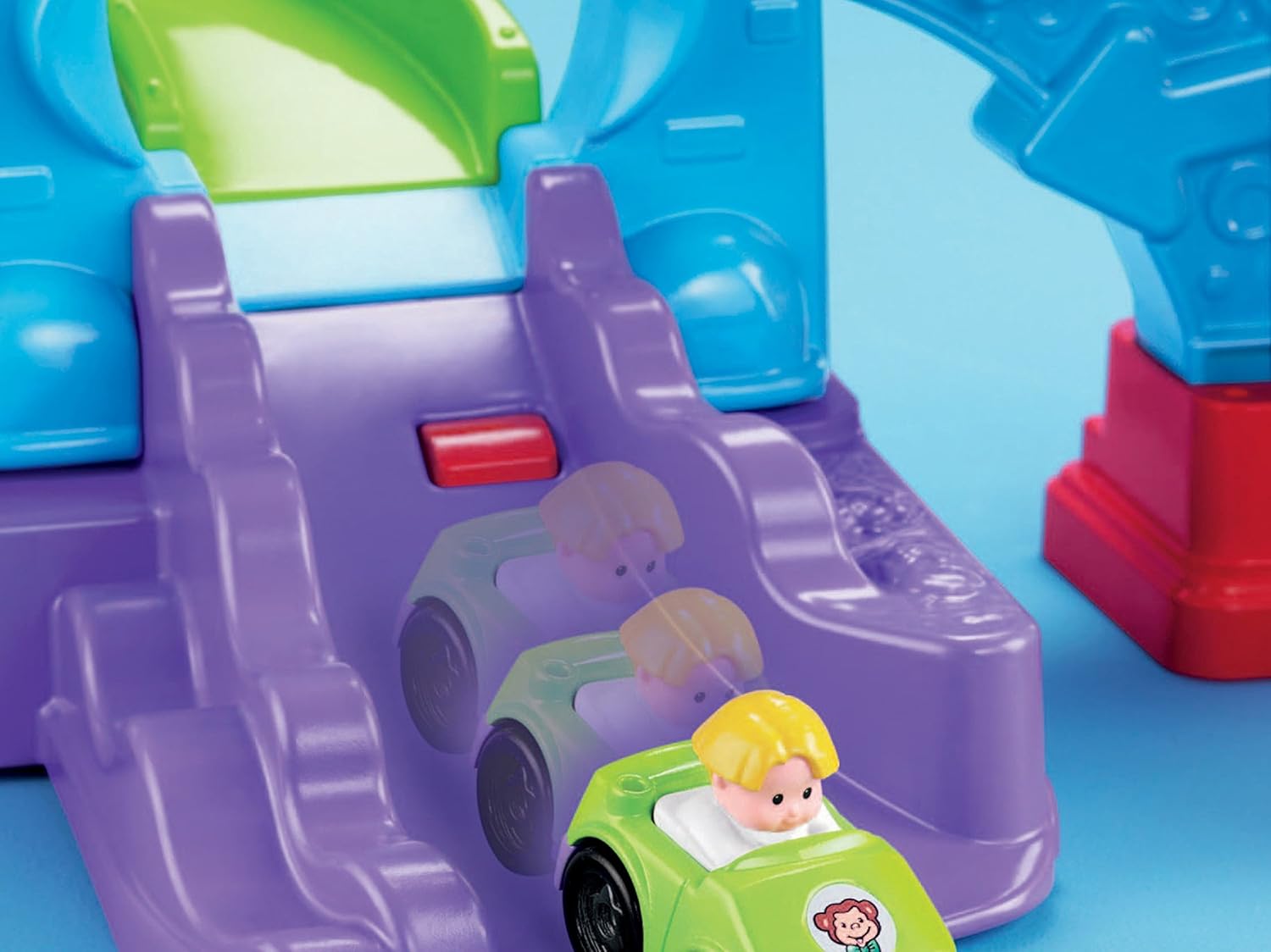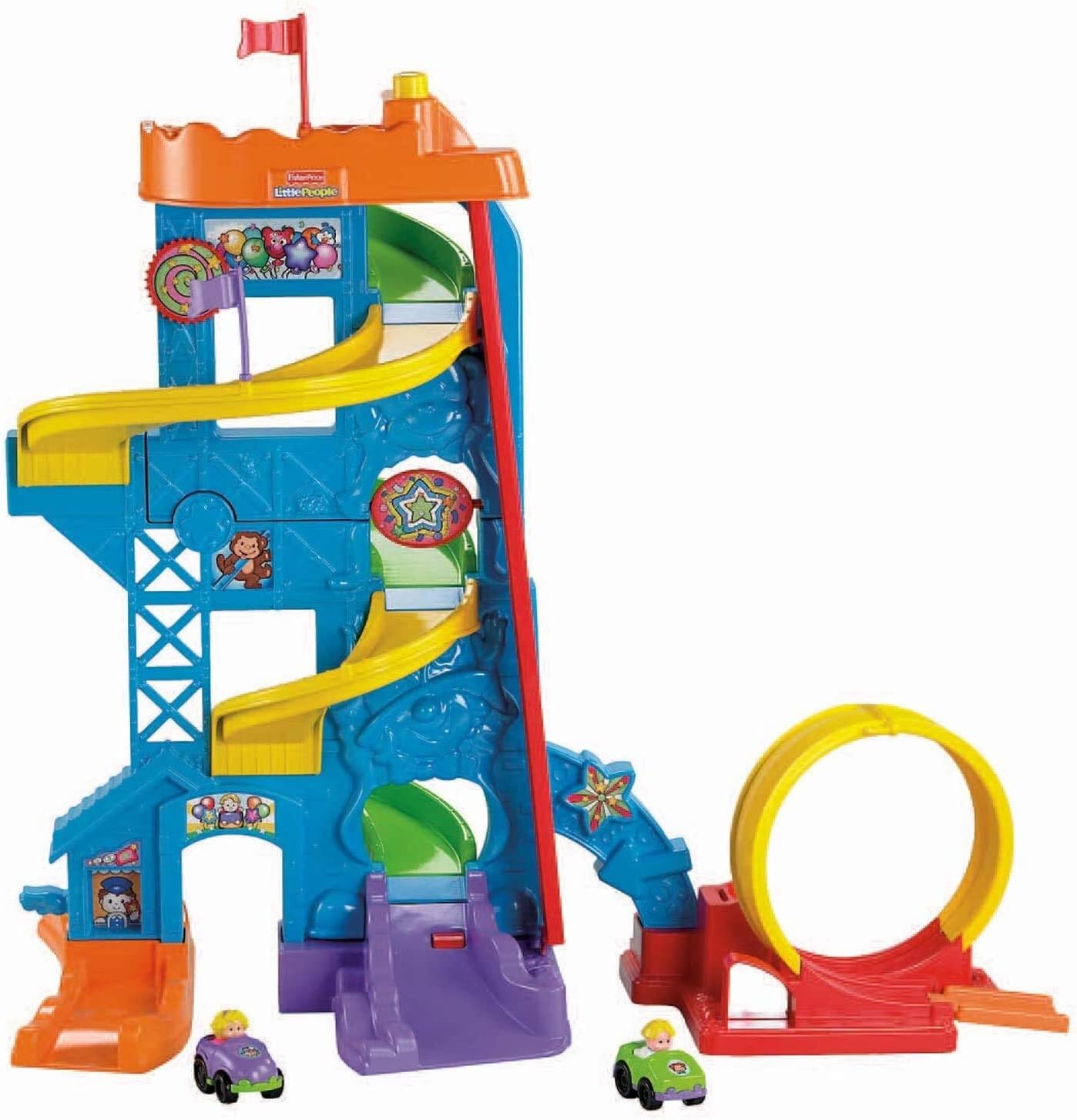 Whee! It's Fisher-Price Little People Wheelies at the Loops 'n Swoops Amusement Park, zipping and zooming up and down and all around! It's over 2 feet tall, so the Wheelies vehicles really zoom down each of the two roller coaster ramps. Plenty of lights and sounds as kids ride around, with gravity-defying loop-the-loop action and more!