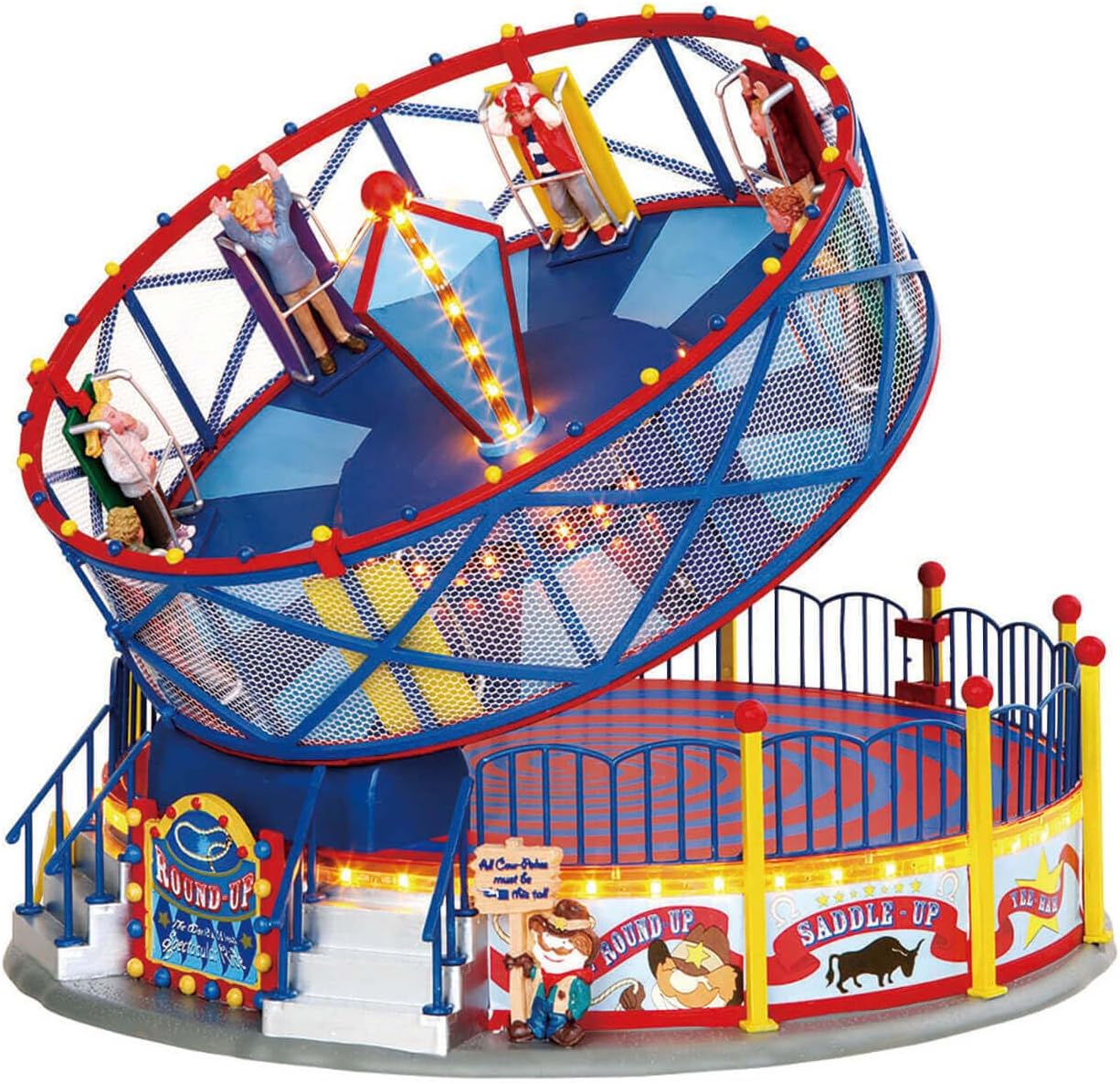 Round Up es la clásica atracción de carnaval que gira y se eleva en un ángulo. Animada con luces y sonidos, esta pieza está garantizada para ser un espectáculo en tu colección.