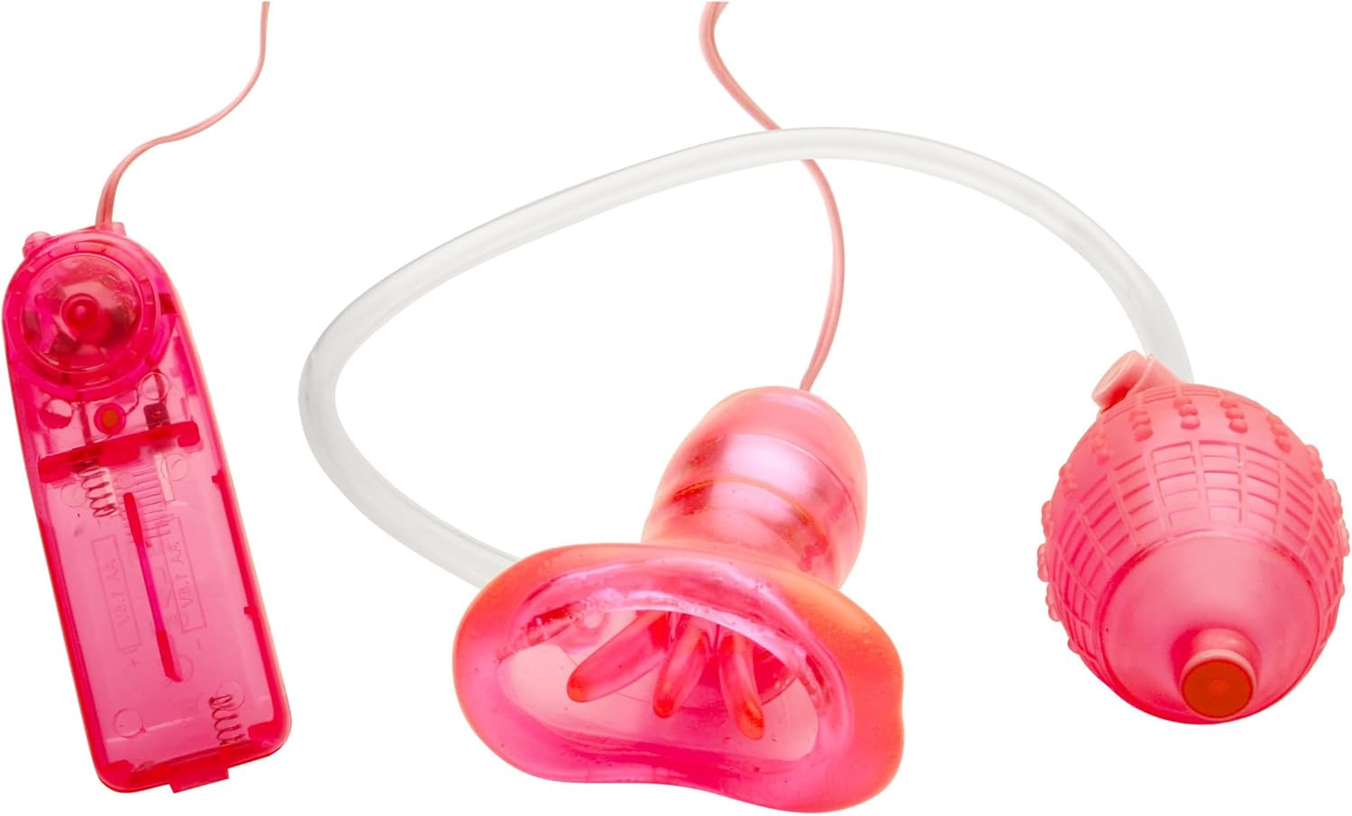 This pretty pink pump gently encourages blood flow to your most sensitive erogenous area, coaxing your flesh into the cup as the delicate stimulators deliver intense vibrations from the powerful bullet just where you want them. The easy to use hand pump just requires a few quick squeezes to work. A wired remote offers multiple speed options, controlled by a turning dial. When you are completely satisfied, just press the quick release valve and the cup slips easily off. The generously sized cup is small enough for targeted pleasure but sized to fit a wide variety of body types. Measurements: Cup Inner Diameter: 2 inches tall, 1 inch wide; Cup Outer Diameter: 3 inches tall, 1.75 inches wide. Note: Requires(2) AA batteries (not included).