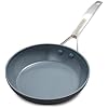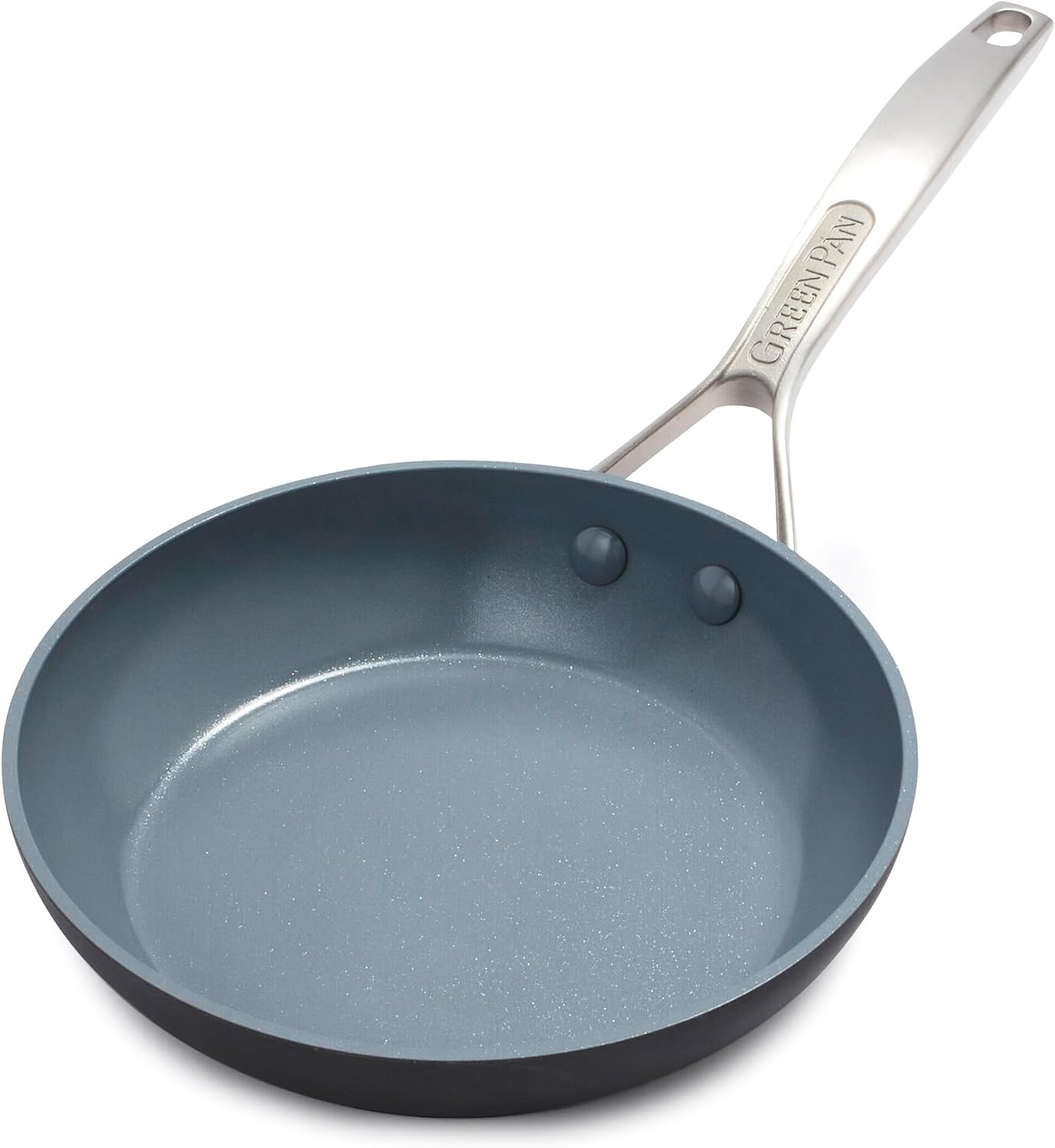 Designed to stand up to your daily routine, this versatile 8” frypan from the Paris Pro collection gives you incredible power and durability. The pan’s Thermolon healthy ceramic nonstick coating is reinforced with diamonds to make it metal utensil safe and ultra heat responsive. GreenPan’s ceramic nonstick coating helps you make any meal healthier because it’s free of PFAS, PFOA, lead, and cadmium and will never release toxic fumes, even when overheated. This pan is crafted with hard anodized aluminum, which is 2x stronger than stainless steel and promotes quick, even heating. The stainless steel handle is ergonomic and riveted for a strong hold. Dishwasher safe. Oven and broiler safe up to 600°F..