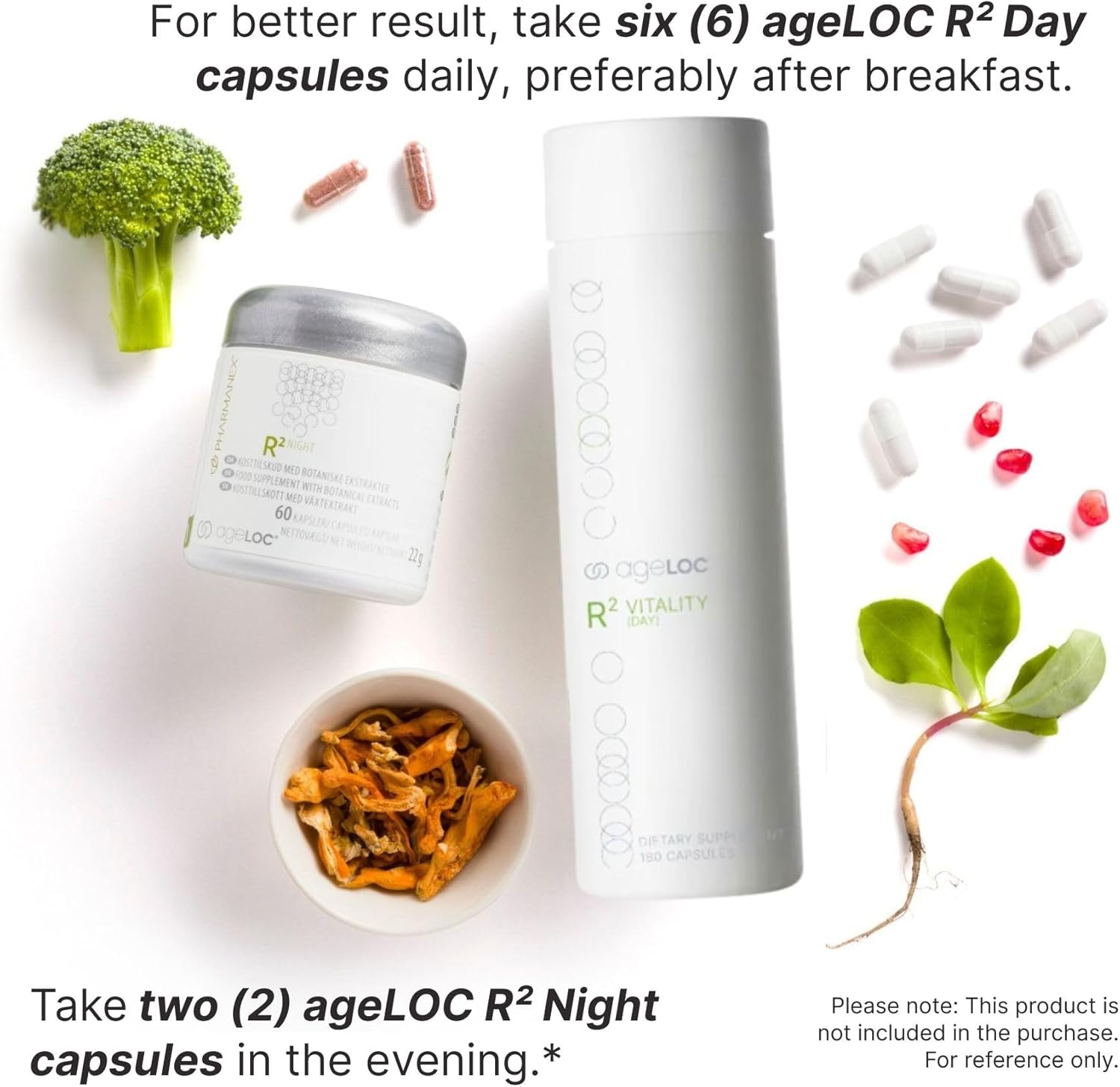 Rediscover your youthful vigor with Nu Skin ageLOC R² Day (Vitality), a powerful product combination designed to put you back in control of how you feel. As the years go by, your body's ability to maintain vitality effectively naturally diminishes. This decline in well-being can be attributed to the cellular changes that occur with age, impacting your ability to function at your best and sapping your youthful vibrancy. However, ageLOC R² Day is here to change the game. With the remarkable science of ageLOC, this advanced formula targets the root causes of aging by focusing on gene expression patterns related to cellular purification and vitality. The result? Superior cellular purification and vitality that will help you feel younger and more vibrant, renewed and recharged. Why You'll Love It: Superior cellular purification and vitality. Targets the sources of aging. Promotes youthful gene expression linked to cellular purification and vitality. Helps you feel younger and more vibrant, ready to take on each new day. ageLOC R² Day is the perfect morning companion to optimize cellular vitality, ensuring that you recharge and regain control of your day. By addressing age-related gene expression changes, this formula empowers you to feel the vitality and vigor that may have seemed out of reach. But ageLOC R² Day is not just about the daytime. When paired with ageLOC R² Night, this dynamic duo becomes a powerful anti-aging nutritional innovation. While the daytime formula enhances cellular vitality, the nighttime counterpart optimizes the natural purification process in each cell. Together, they prepare you to wake up feeling refreshed and renewed. With ageLOC R², you can take the reins of aging, revitalizing your vitality and supporting your well-being. This innovative supplement offers you two supplements, countless powerful benefits, and the confidence to live life to the fullest.